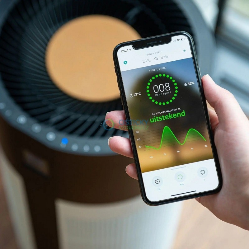 Elegance a výkon se spojují v Tube, SMART čističce vzduchu s ohromující kapacitou 550 m³ za hodinu (CADR = Clean Air Delivery Rate). Duux Tube je vhodná pro místnosti o velikosti až 110 m² a zaručuje optimální účinnost filtrace vzduchu díky svému třívrstvému filtru (předfiltr, filtr HEPA H13 a filtr s aktivním uhlím). Navíc automaticky přizpůsobuje rychlost čištění kvalitě okolního vzduchu, měřené laserovým senzorem PM2,5. A díky nové aplikaci Duux lze Tube ovládat kdykoli a kdekoli.