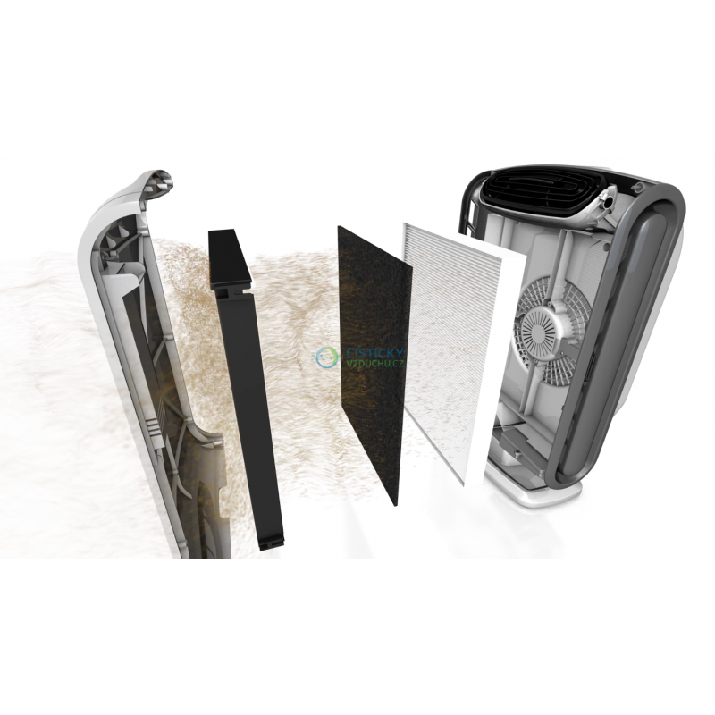 - Čtyřstupňový filtrační systém zachycuje až 99,97% veškerých znečišťujících látek, do velikosti až 0,3 mikronu.