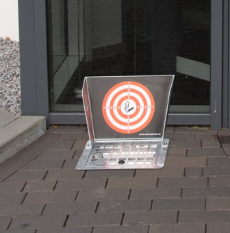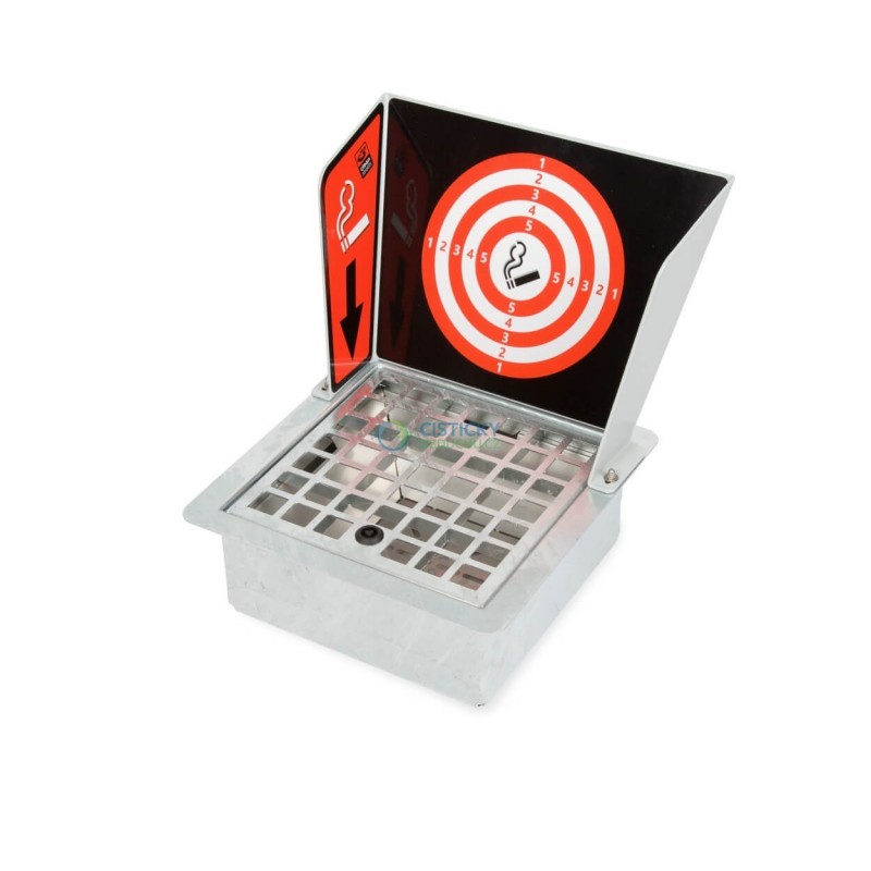 Levnější a jednodušší varianta venkovního popelníku na cigaretové nedopalky a žvýkačky, včetně vhazovacího trychtýře s motivem terče.