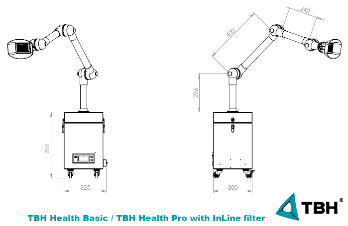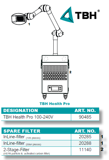 Odsávací jednotka TBH Health Pro 90485, s patentovaným "InLine" předfiltrem, nabízí kompaktní systém pro každodenní odsávání výparů v lékařských ordinacích a na operačních sálech. Vysoce účinný dvoustupňový filtr (kombinace HEPA H13 a aktivní uhlí) spolehlivě odstraňuje viry, bakterie a částice pokožky.